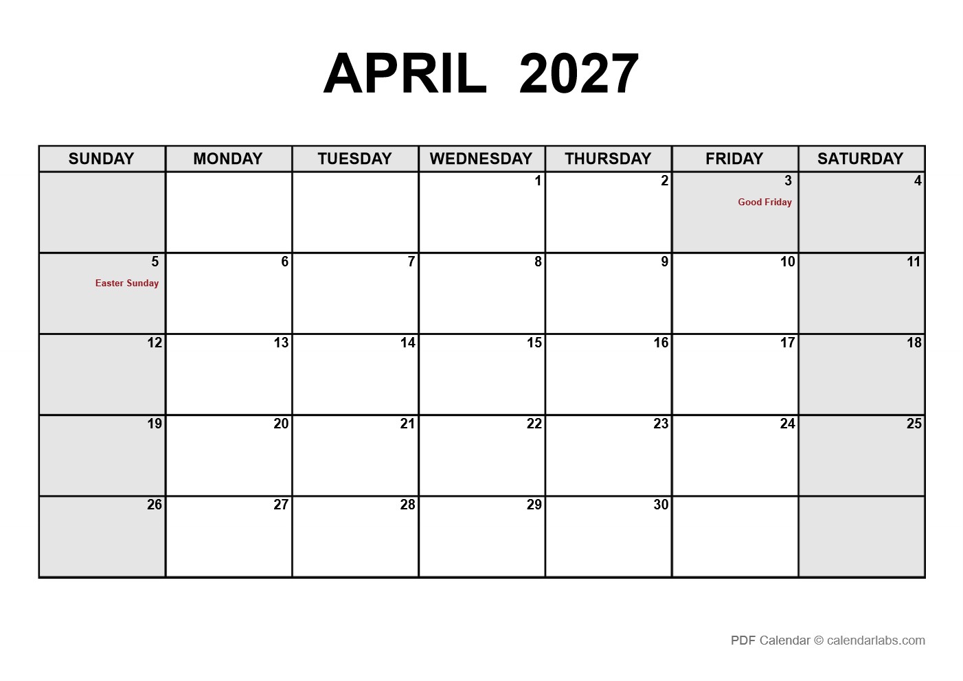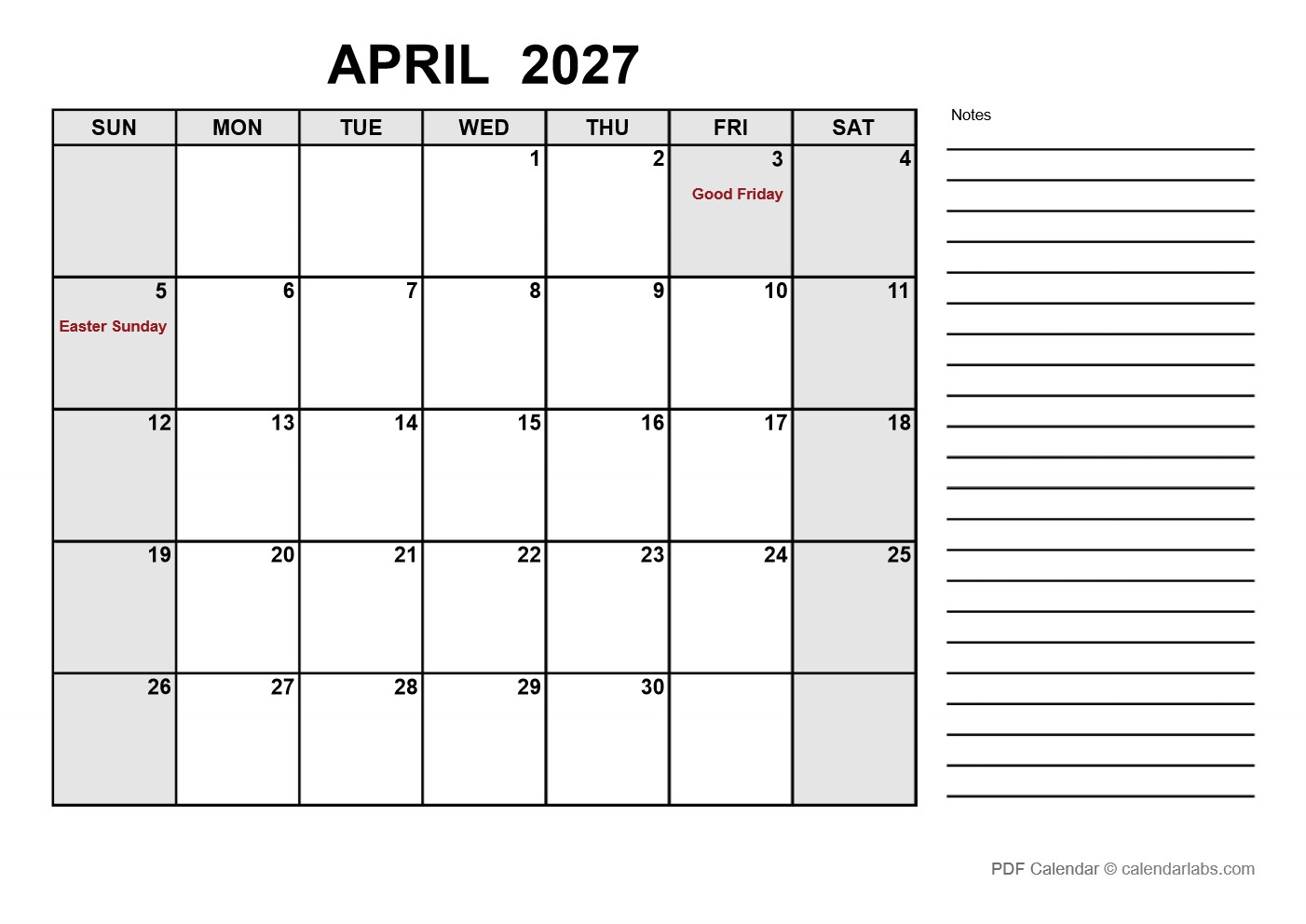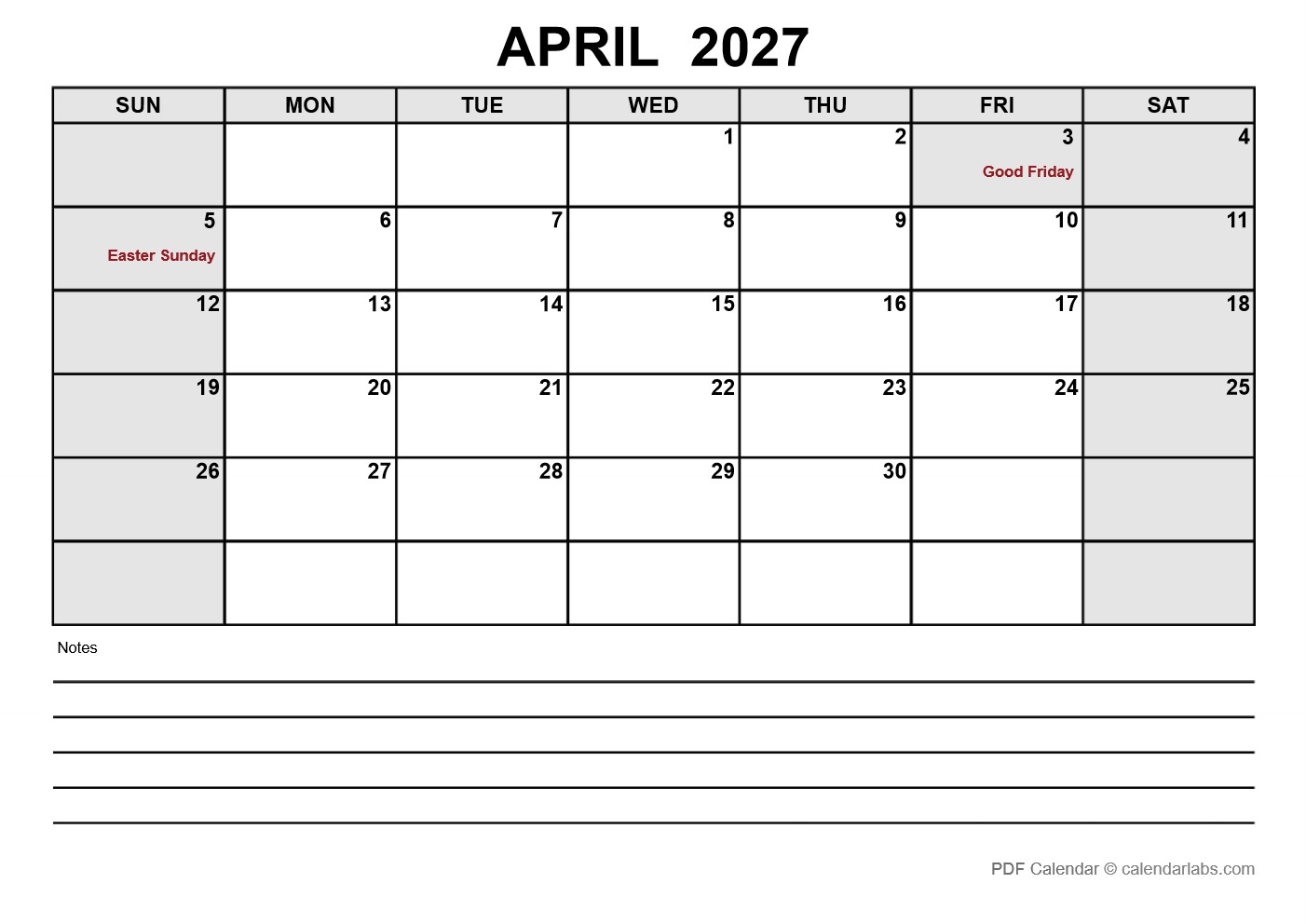 A free printable one-page April 2027 calendar PDF template with holidays and notes space for each day.