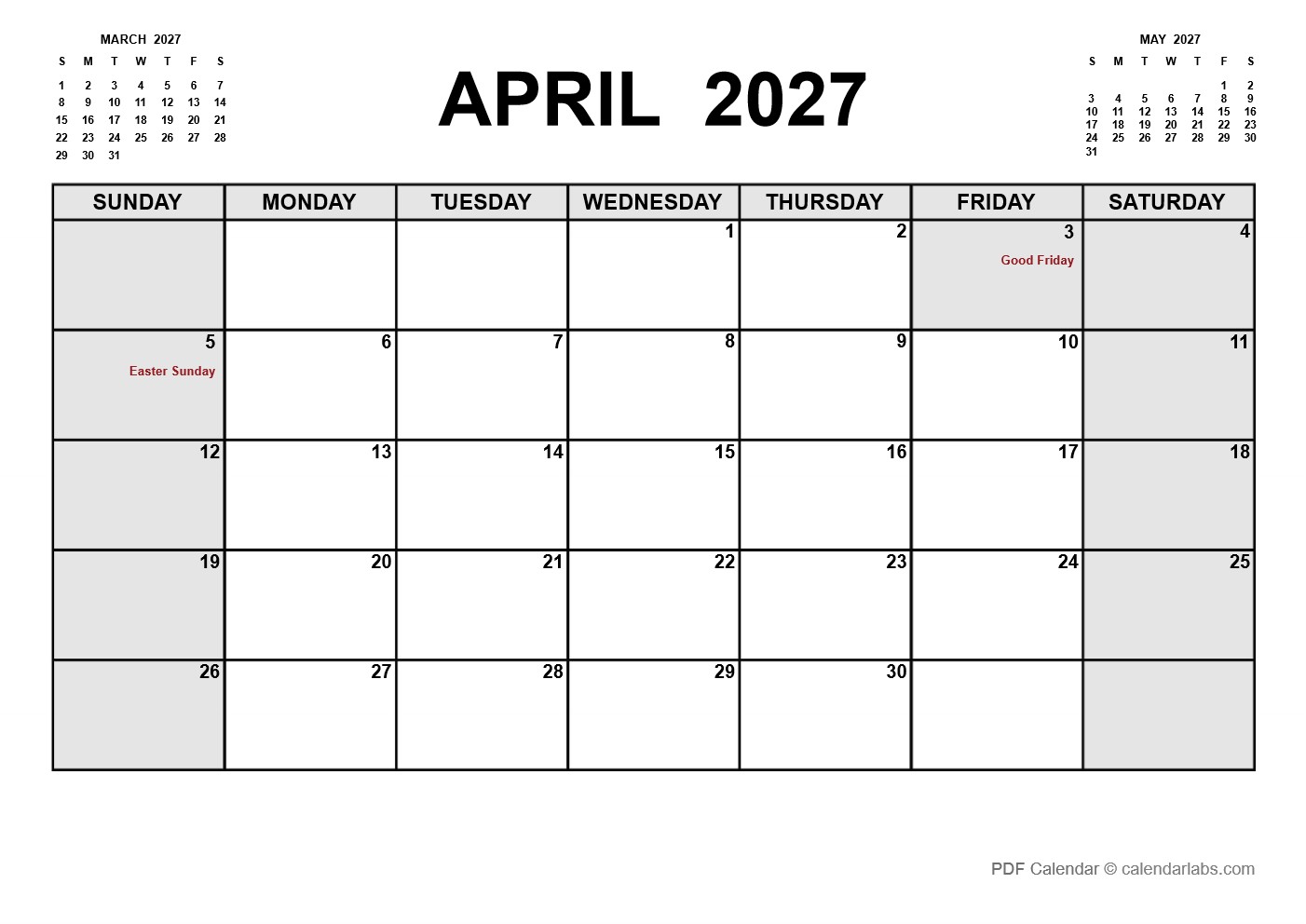 A landscape layout April 2027 calendar with holidays and next month calendar reference.
