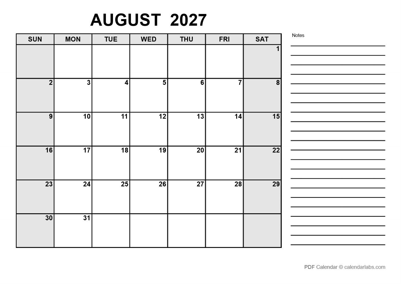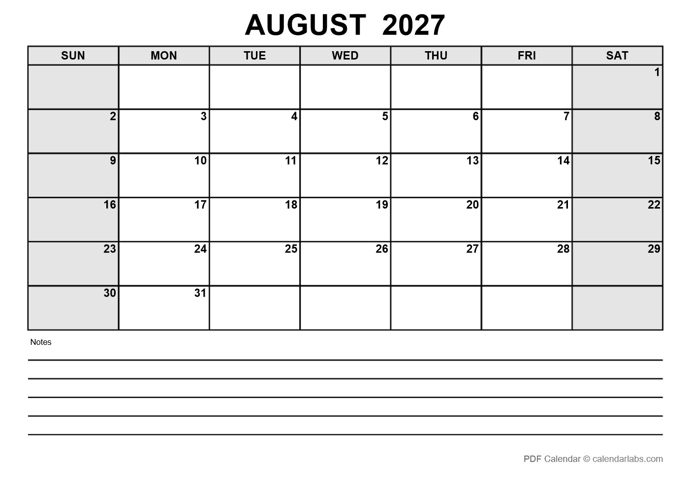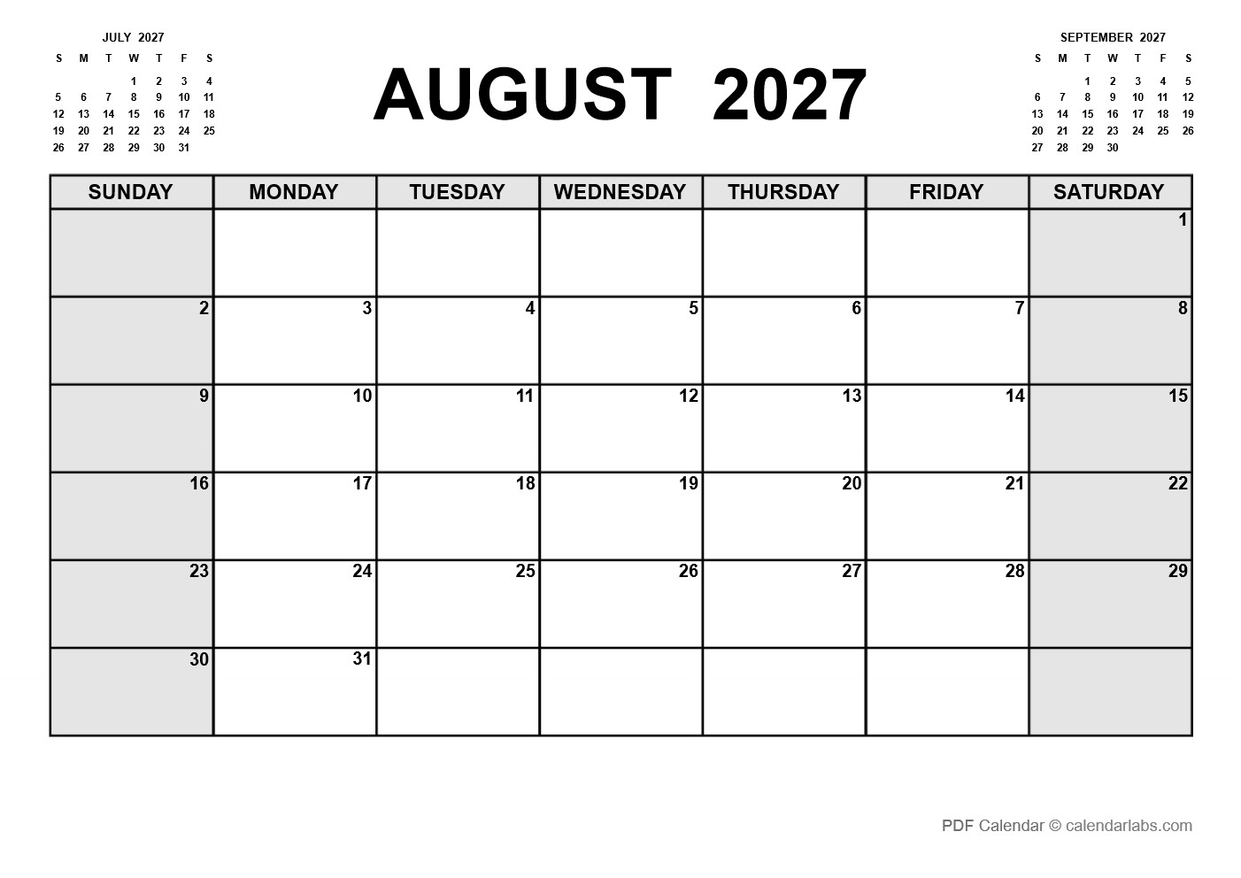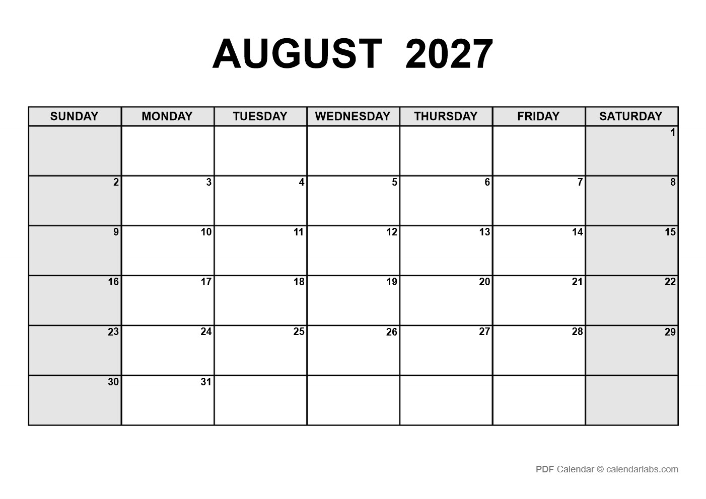 This August 2027 calendar page will satisfy any kind of month calendar needs. We have listed here online, printable, Word, Excel, PDF and Blank calendar for August 2027. You can print the calendar page directly or download templates and print from any printer.