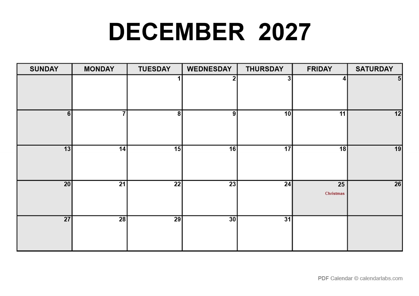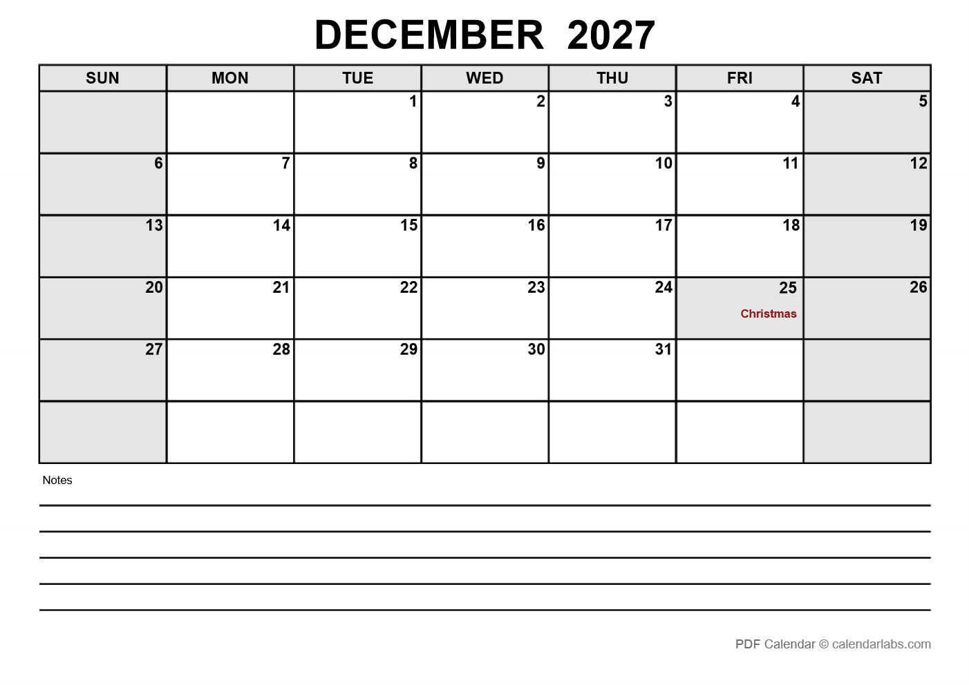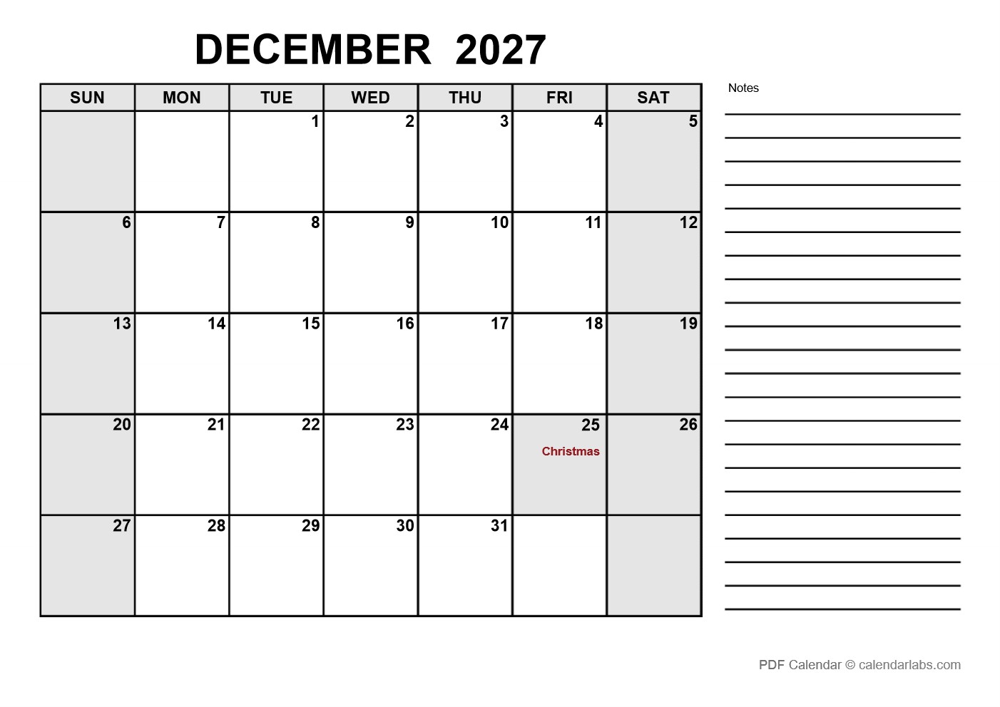 A free printable one-page December 2027 calendar PDF template with holidays and notes space for each day.
