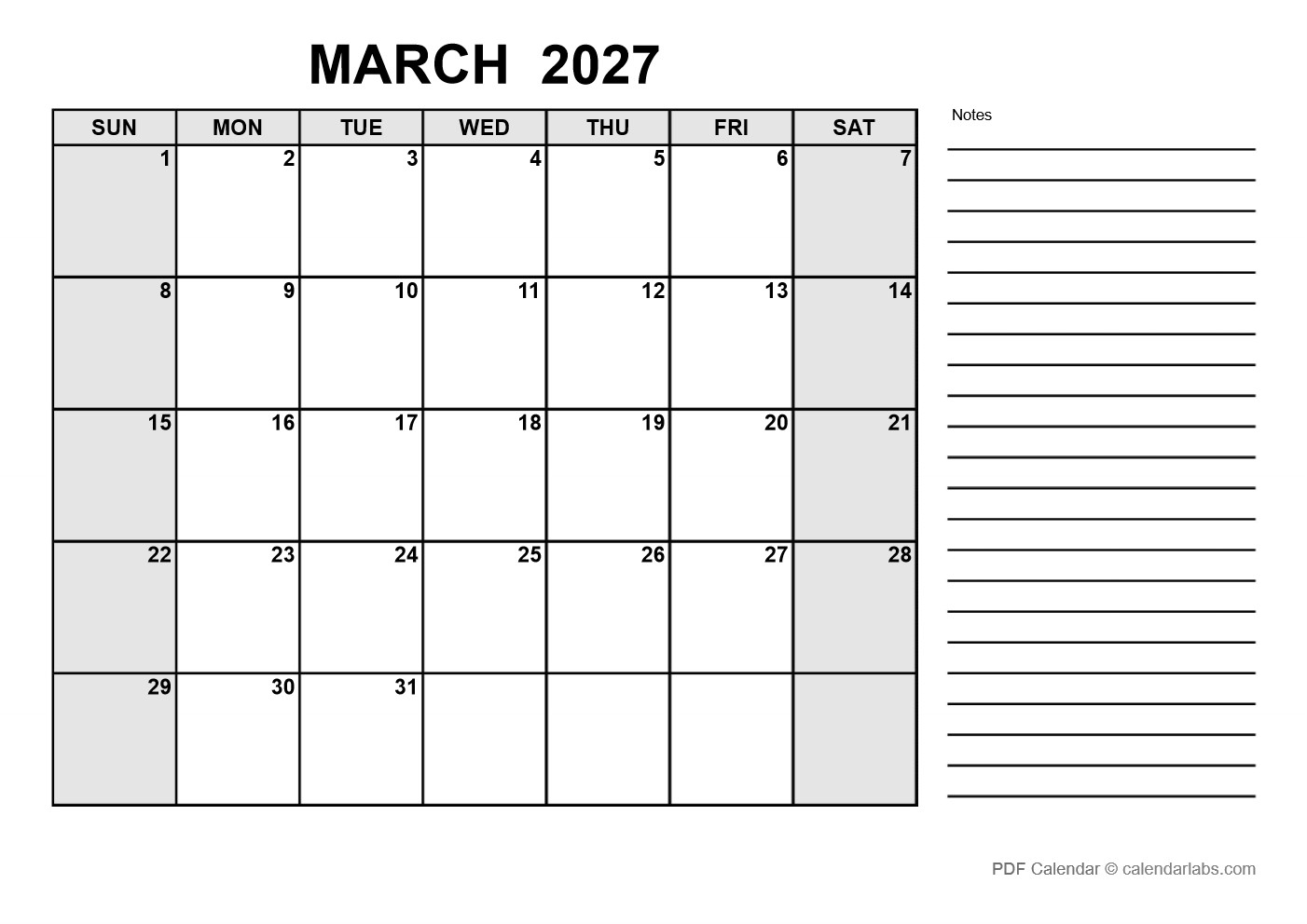 A landscape layout, blank March 2027 calendar PDF template with large notes space at the bottom.