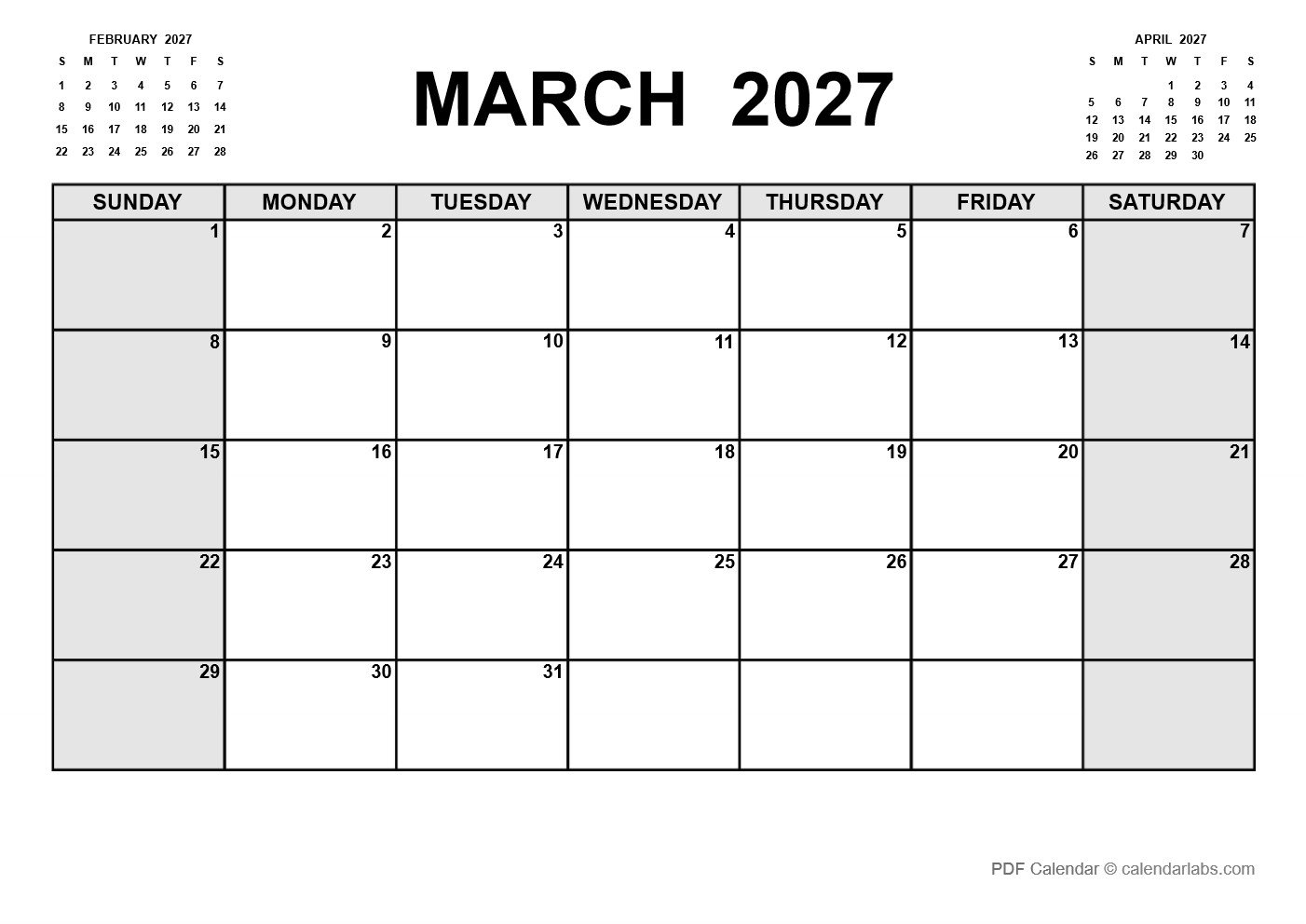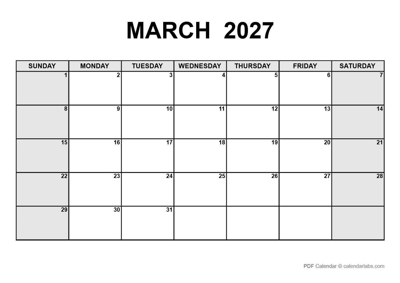 Blank March 2027 Calendar PDF