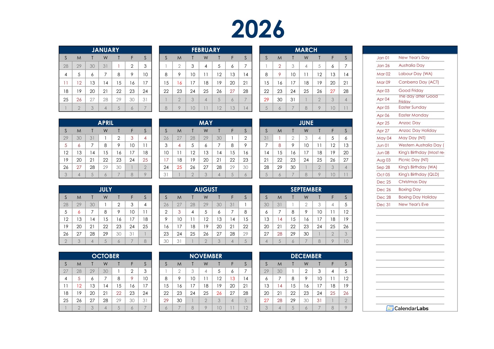 2026 AUSTRALIA ANNUAL CALENDAR WITH HOLIDAYS