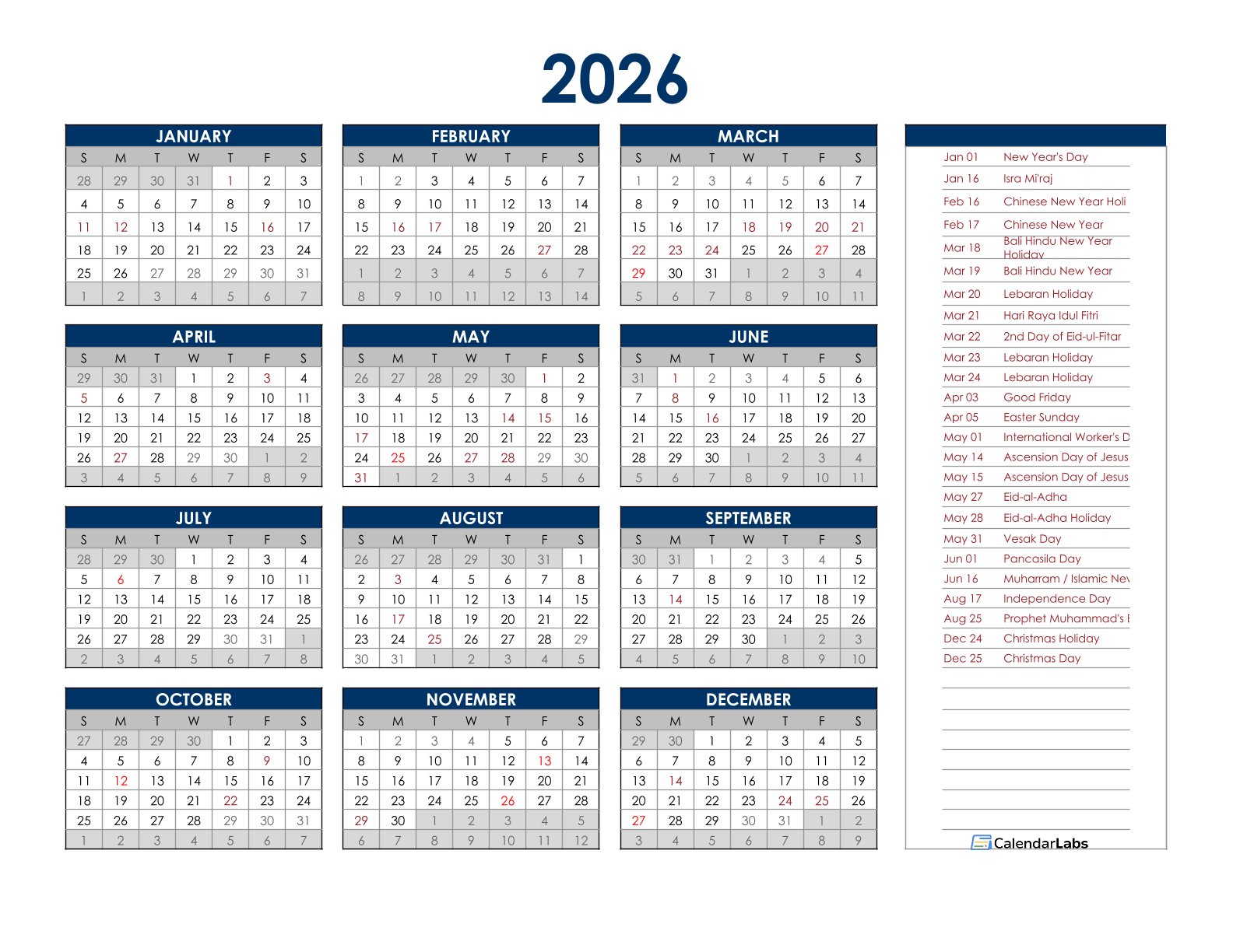 2026 INDONESIA ANNUAL CALENDAR WITH HOLIDAYS