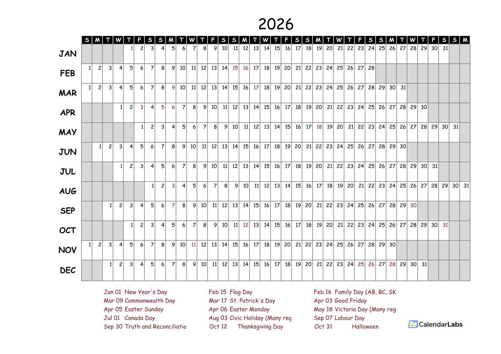2026 YEARLY PROJECT TIMELINE CALENDAR CANADA