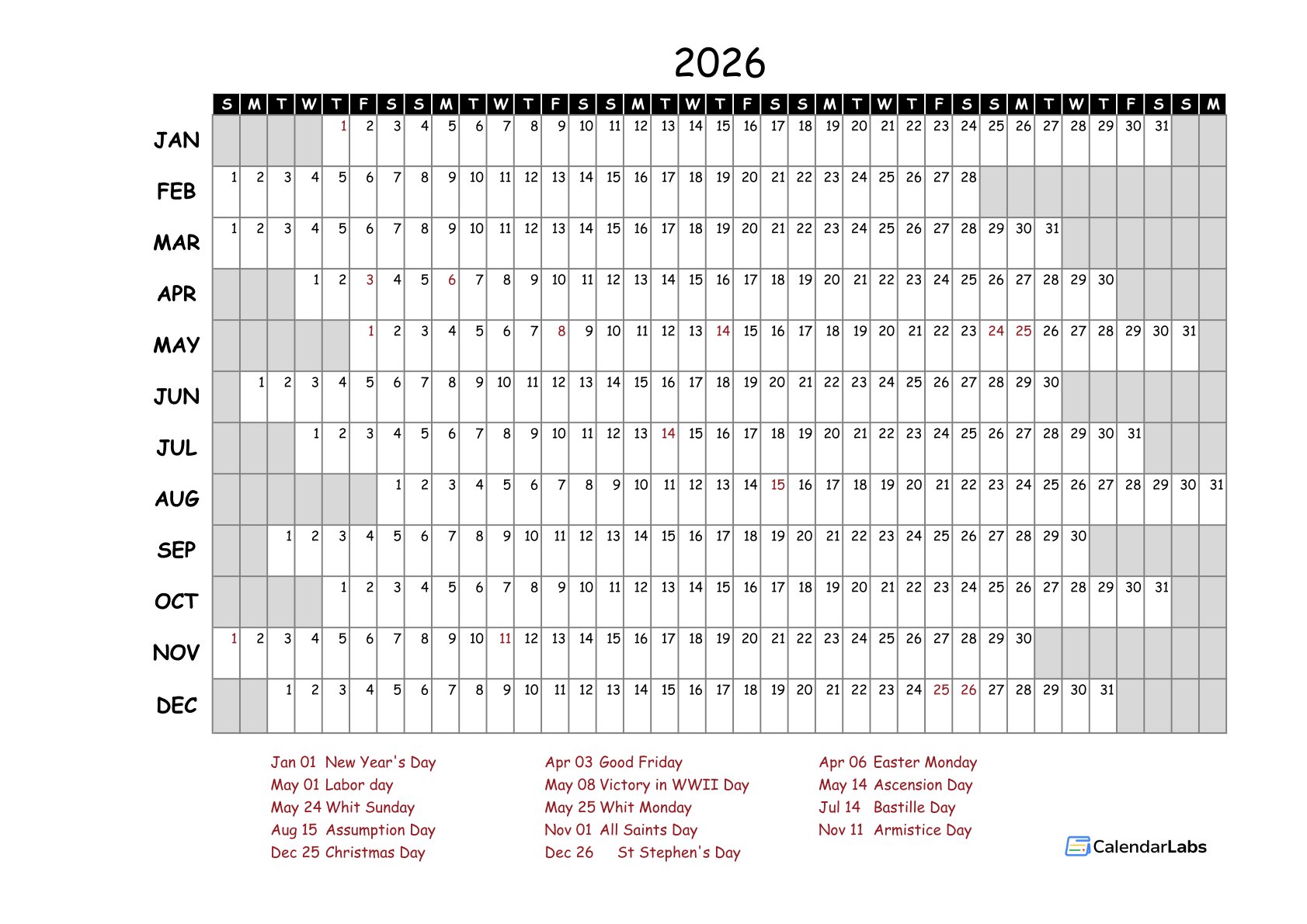 2026 YEARLY PROJECT TIMELINE CALENDAR FRANCE
