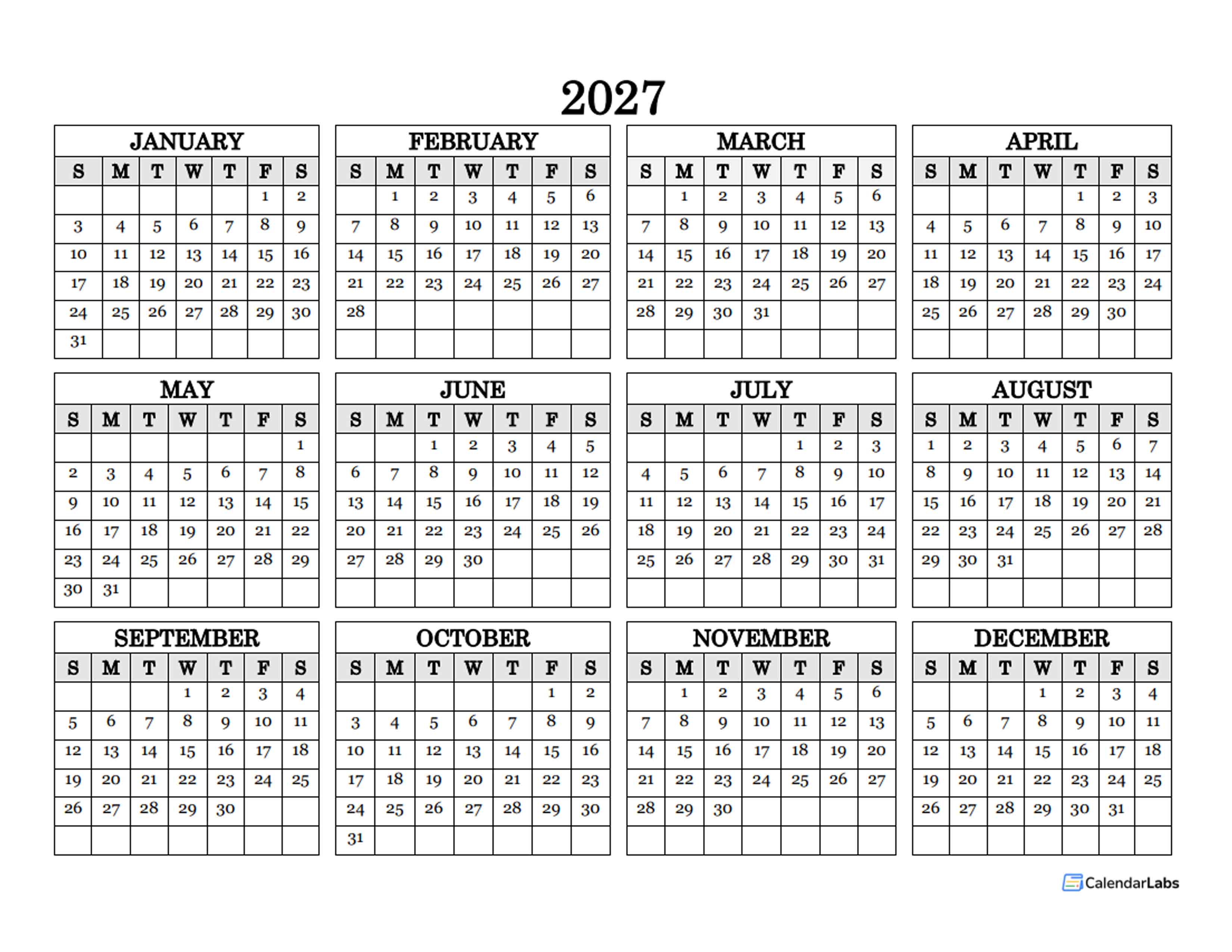 2027 BLANK YEARLY CALENDAR LANDSCAPE