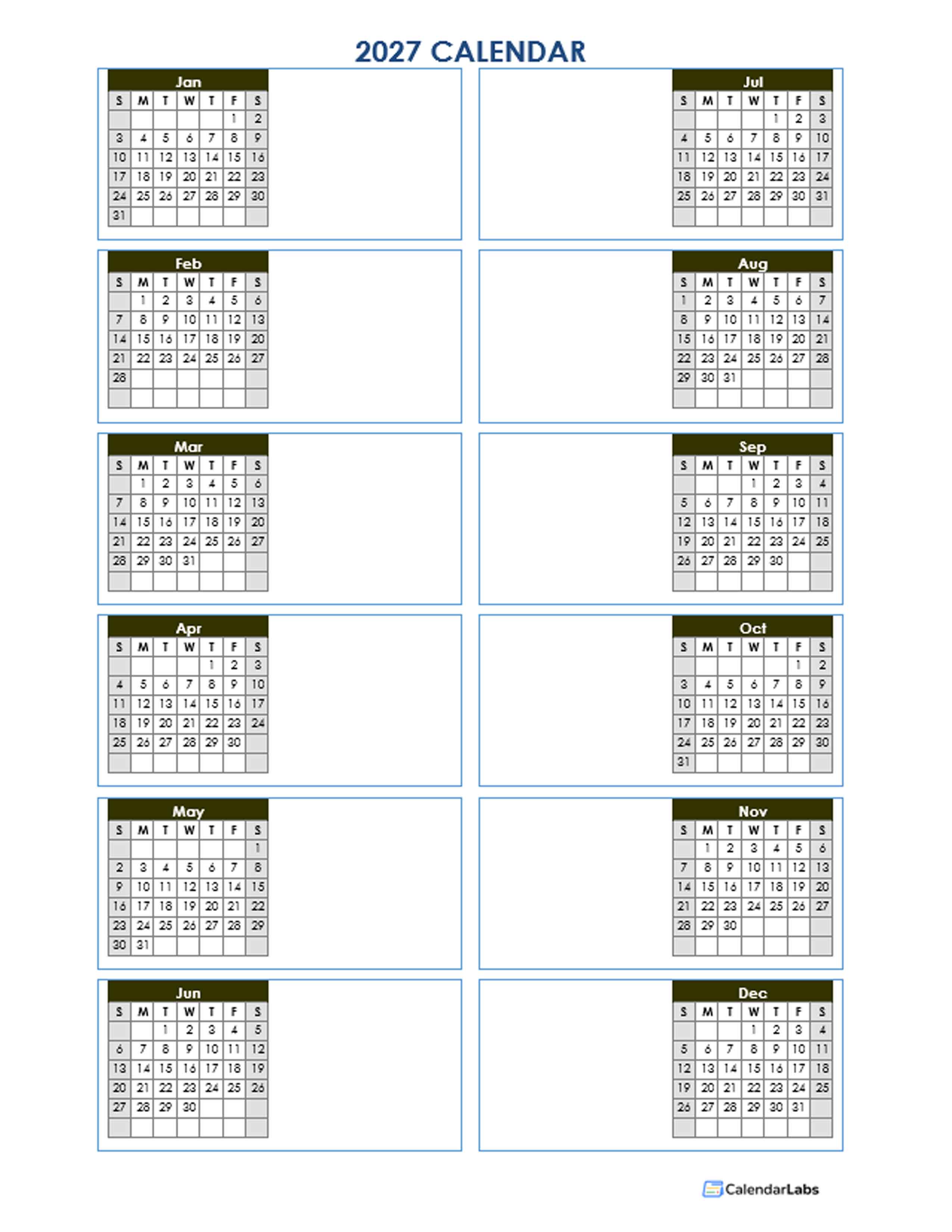 2027 Blank Yearly Calendar Template Vertical Design