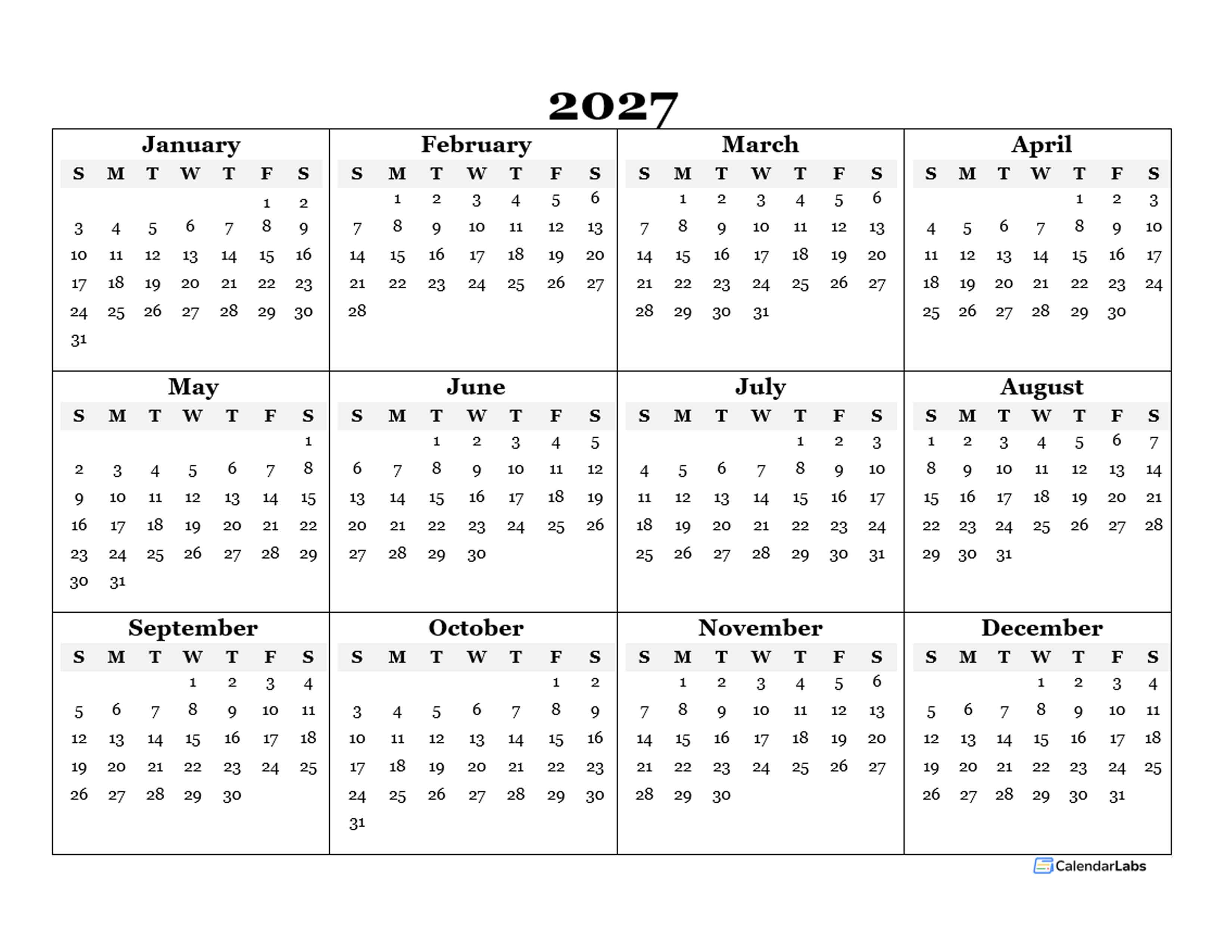 2027 BLANK YEARLY CALENDAR TEMPLATE