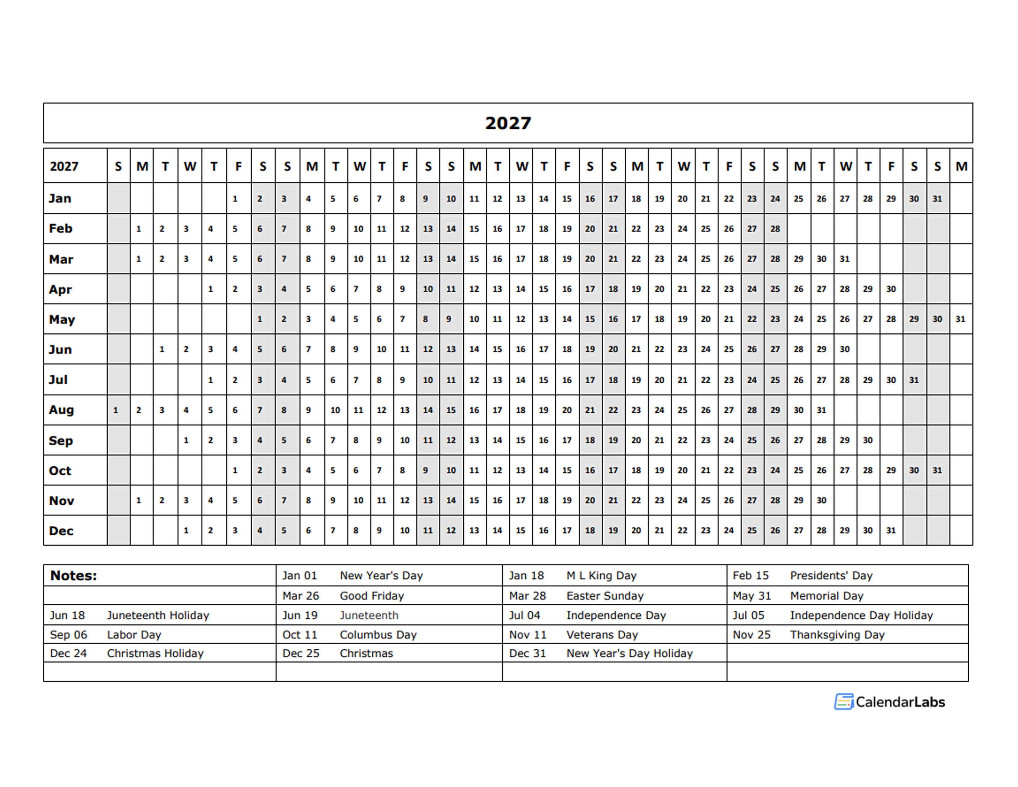 2027 CALENDAR TEMPLATE YEAR AT A GLANCE