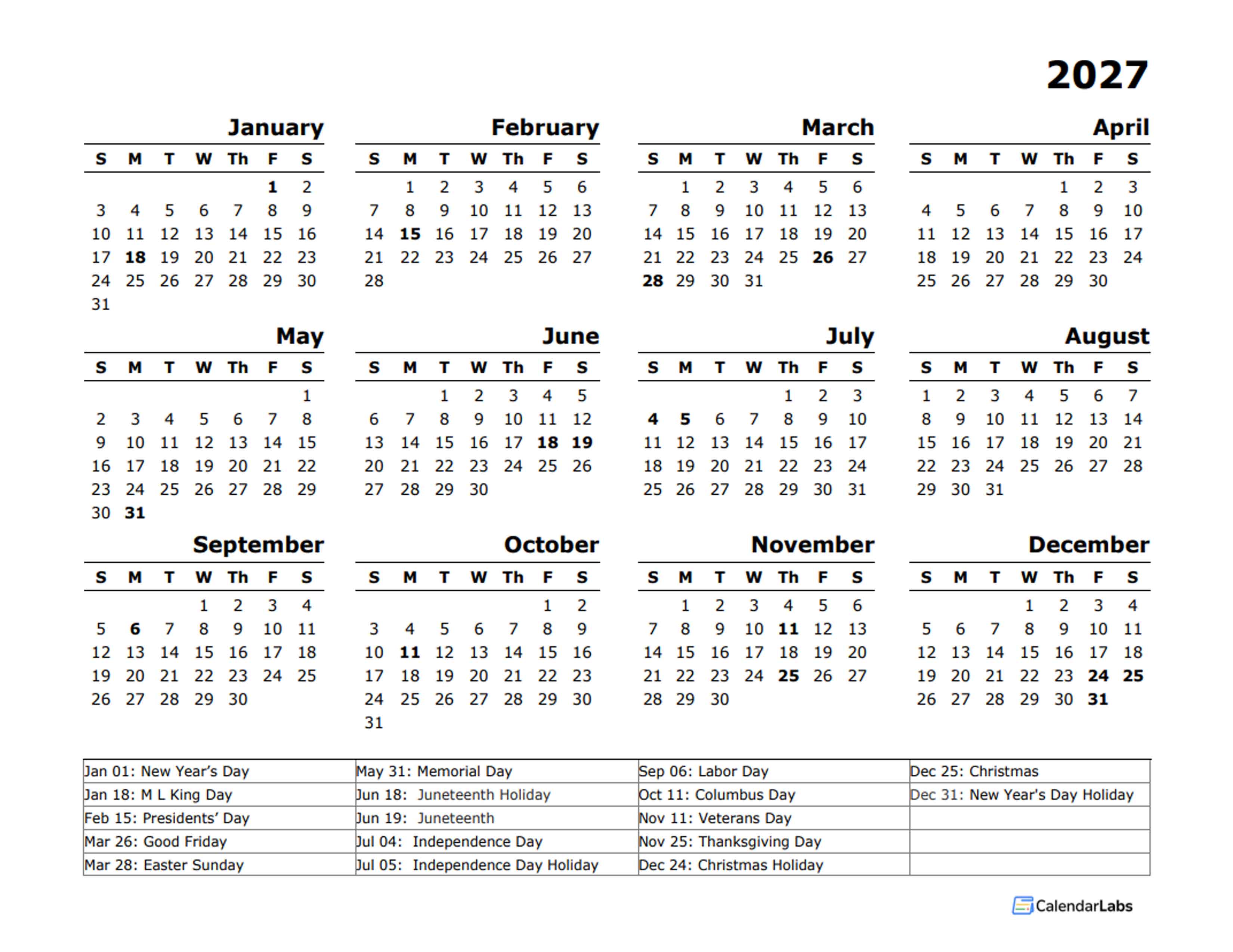 2027 YEARLY CALENDAR TEMPLATE WITH US HOLIDAYS