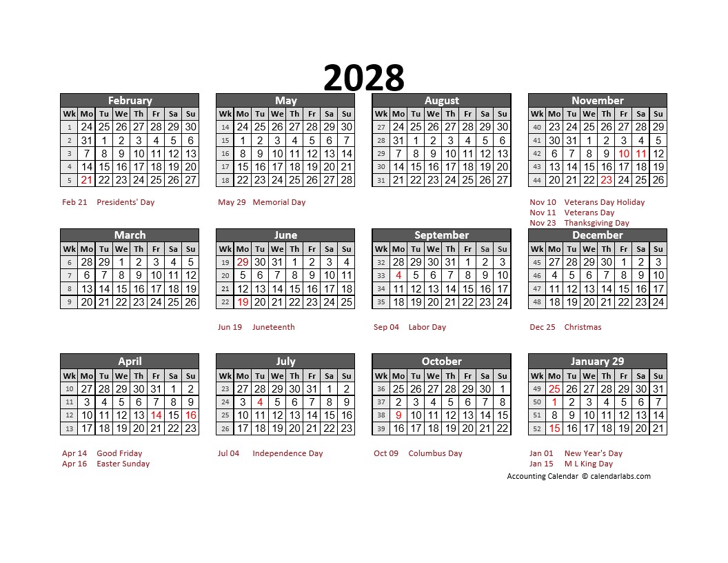 2028 Retail Accounting Calendar 4-4-5